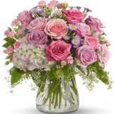 A whisper-quiet affirmation of love. Subtle shadings of pink and white roses, lilies and delicate Queen Anne's lace in a simple, elegant vase, this is an elegant way to share your love and sympathy.